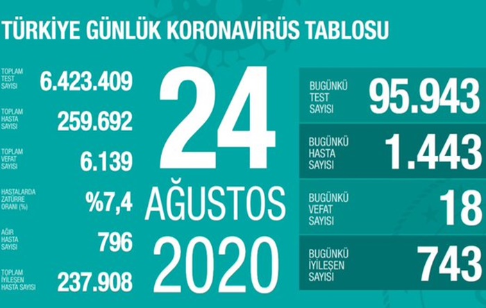 İşte 24 Ağustos 2020 itibariyle Türkiye Günlük Koronavirüs Tablosu;