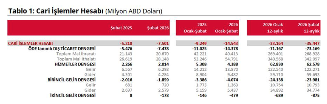 Yıllıklandırılmış göstergeler, açığın kalıcılaştığına işaret etti. Şubat itibarıyla yıllık cari açık yaklaşık 35,4 milyar dolara yükselirken, yıllıklandırılmış dış ticaret açığı 73,2 milyar dolar olarak gerçekleşti. Aynı dönemde hizmetler dengesi 62,6 milyar dolar fazla verdi; buna karşın birincil gelir dengesi 24,0 milyar dolarlık açıkla (faiz/kâr transferleri gibi kalemler) cari dengeyi aşağı çekti. İkincil gelir dengesi de 0,9 milyar dolar açık verdi.