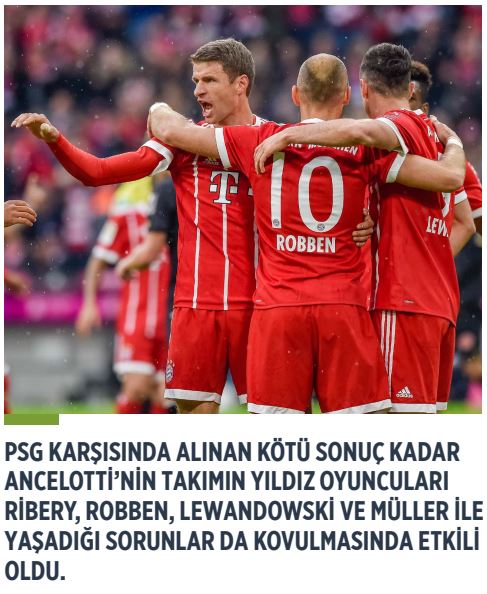PSG karşısındaki yenilgiyi ‘acı verici’ olarak tanımlayan Bayern Münih CEO’su Karl Heinz Rummenigge, Ancelotti’nin kovulacağı sinyalini verdi. PSG karşısında alınan kötü sonuç kadar Ancelotti’nin takımın yıldız oyuncuları Ribery, Robben, Lewandowski ve Müller ile yaşadığı sorunlar da kovulmasında etkili oldu. PSG karşısında Mats Hummels, Arjen Robben ve Frank Ribery’i yedek bekletti. Başkan Hoeness, “Teknik direktör, tek seferde 5 oyuncuyu karşısına aldı. Buna sonuna kadar dayanamazdı. Teknik direktör olarak en tanınmış oyuncularını karşına almamalısın” açıklamasını yapmıştı.