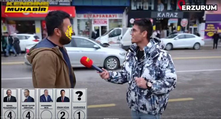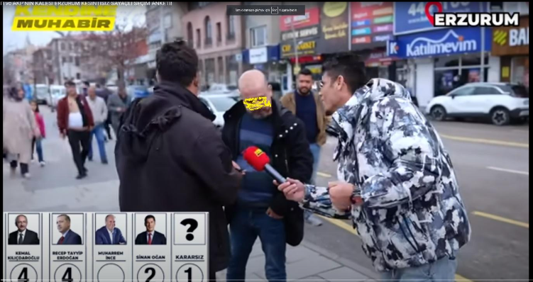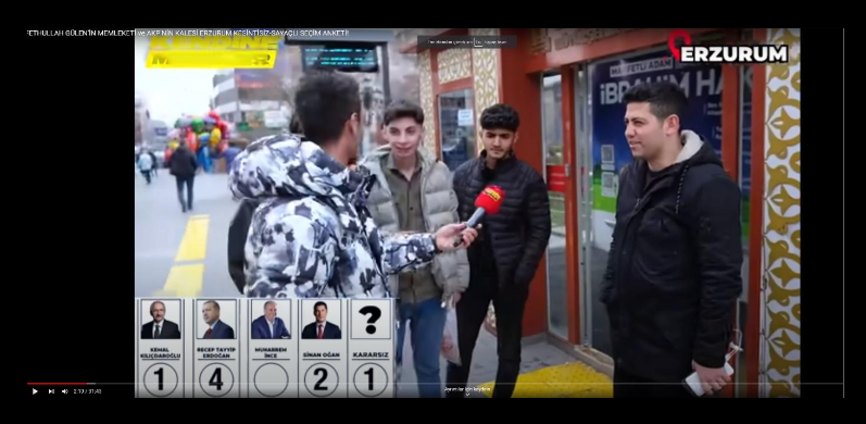 Muhabir arkadaş (Hasan Köksoy) her ilde olduğu gibi Erzurum’da da şehrin en işlek caddesine çıkmış önünden geçenlere soruyor. Başlarda orta yaşın üzerinde olanların çoğu Erdoğan cevabı veriyor. 4 genç geliyor sonra, önce fikirlerini açıklamak istemiyorlar. Ardından biri “Değişim şart” diyor ve Kılıçdaroğlu’na oy vereceğini söylüyor.