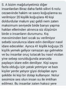 “S.A. bizim mağduriyetimiz diğer insanlardan biraz daha farklı. Silivri 6 nolu cezaevinde hakim ve savcı koğuşlarına su verilmiyor. 20 kişilik koğuşlara 40 kişi doldurdular. Malum yaz geldi, nem zaten maksimum seviyede. Bir de banyo yapma hakları ellerinden alınınca siz düşünün bir de o insanların durumunu. Kış mevsiminden beri sıcak su verilmiyor. Sebebi sorulunca idaren edin deniliyor. Nasıl idare edecekler? Ayrıca 41 kişilik koğuşa 25 kişilik yemek geliyor. Ramazan ayı gelmekte ve bu insanlar oruç tutacak. Bu nasıl vicdan yine sebep sorulduğunda aranızda paylaşın idaren edin deniyor. Kişi sayısı fazla olduğu için yatak yetmiyor ve bazı kişiler yerde yatıyor. Giysi dolapları aynı şekilde iki kişi bir dolap kullanıyor. Ne olur sesimize ses olun, insan su ile imtihan edilmez. Bu insanlar zaten haksız yere…”