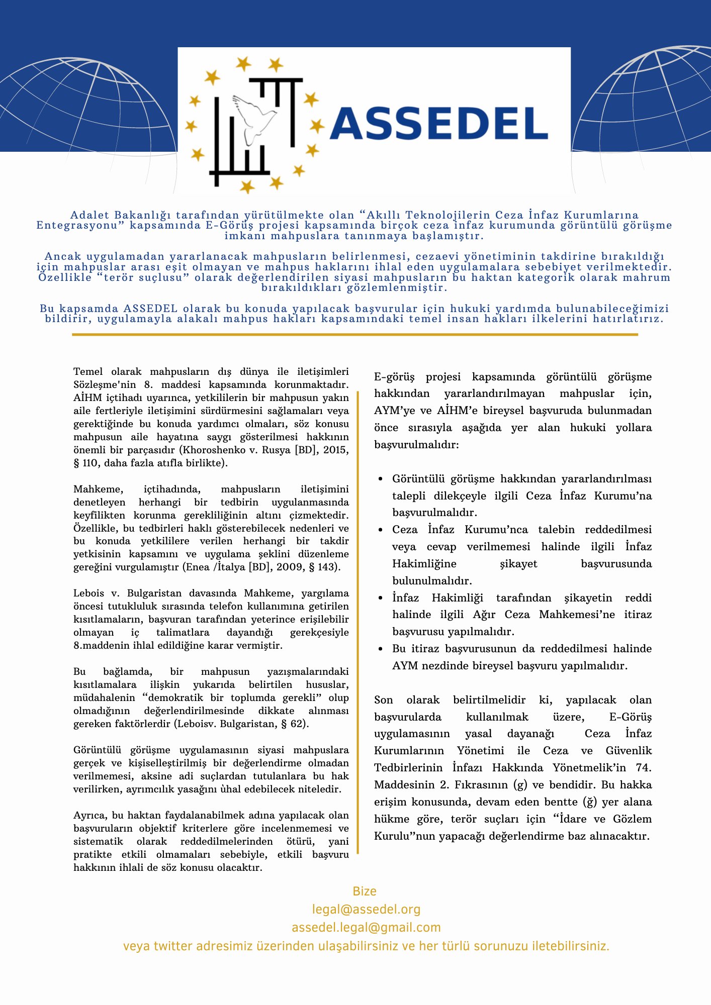 Strazburg merkezli Avrupa Hak ve Özgürlükleri Savunma Derneği (ASSEDEL), Türkiye’de “Akıllı Teknolojilerin Ceza İnfaz Kurumlarına Entegrasyonu” kapsamında E-Görüş’ün birçok cezaevinde başladığını ama birçok mahpusun bundan yararlandırılmadığını açıkladı.