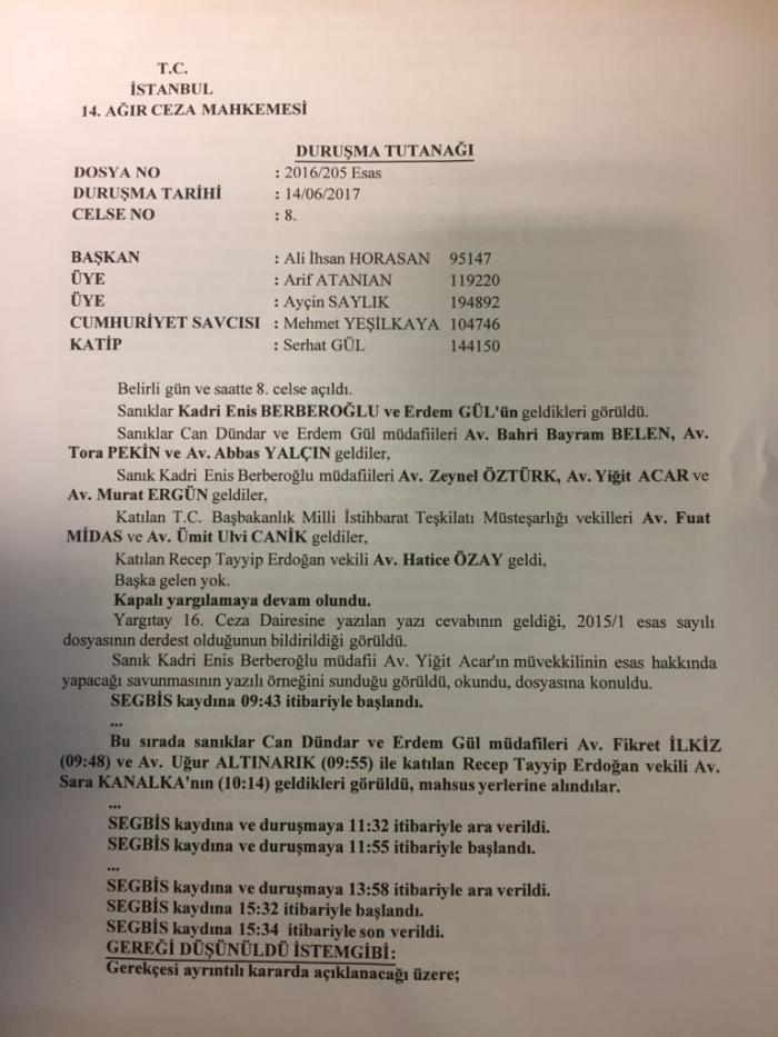 İstanbul 14. Ağır Ceza Mahkemesi’nde görülen duruşmaya sanıklar CHP Milletvekili Enis Berberoğlu ile gazeteci Erdem Gül katıldı. Yurtdışında olan Can Dündar ise duruşmaya katılmadı.