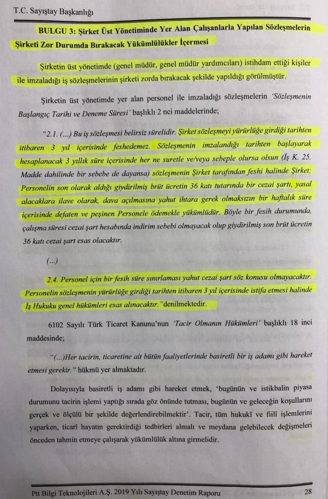 “PTT Bilgi Teknolojileri AŞ’nin genel müdür ve genel müdür yardımcıları kendilerine sözleşme hazırlayıp iş akitleri fesih edildiğinde de brüt maaşlarının 36 katı kadar tazminat alıyor. Şimdi bakın, daha da acısı… Sayıştay’ın kelimeleriyle okuyorum: