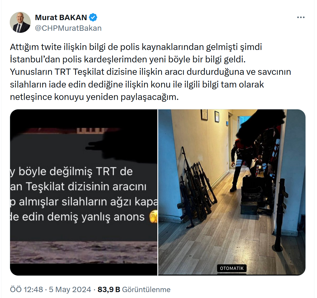 Ancak söz konusu silahların TRT’de yayınlanan bir dizinin setine gittiği ve uçlarının kapalı olduğu öğrenildi. Bunun üzerine Murat Bakan yeni bir paylaşım daha yaptı ve şunları yazdı: “Attığım twite ilişkin bilgi de polis kaynaklarından gelmişti şimdi İstanbul’dan polis kardeşlerimden yeni böyle bir bilgi geldi. Yunusların TRT Teşkilat dizisine ilişkin aracı durdurduğuna ve savcının silahların iade edin dediğine ilişkin konu ile ilgili bilgi tam olarak netleşince konuyu yeniden paylaşacağım.”