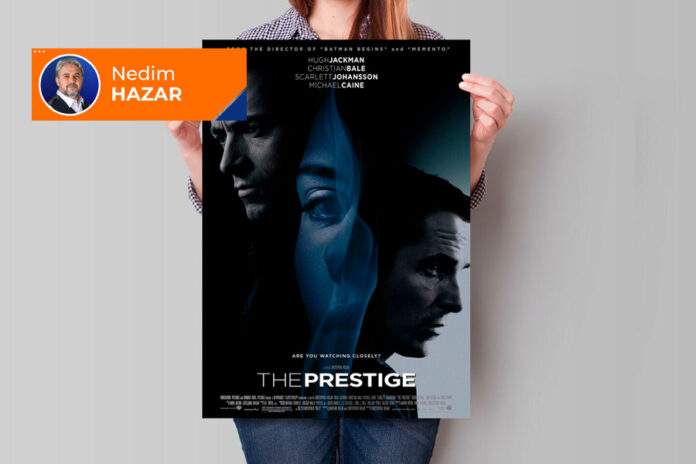 Tekrar hatırlatalım; Viktorya dönemi Londra’sında geçen filmde, Christian Bale ve Hugh Jackman, karanlık bir rekabete sahip iki sahne sihirbazını canlandırıyor. Bale, Alfred Borden rolünde, kendini işine adamış ve sert bir karakteri oynuyor. Jackman’ın canlandırdığı Robert Angier ise daha cilalı ve karizmatik, daha iyi bir şovmendir. Aslında rekabetleri, iyi niyetli bir yarışma olarak başlar; Borden akıl, Angier ise yüz olarak kullanılmaktadır. Sahnede yaşanan bir trajedi sonrasında ilişkileri, birbirlerini sabote etmeye çalışan çirkin bir rekabete dönüşür. Borden inanılmaz yeni bir numara sergiler ve Angier ise, sihrin arkasındaki sırrı keşfetmeye takıntılı hale getirir.