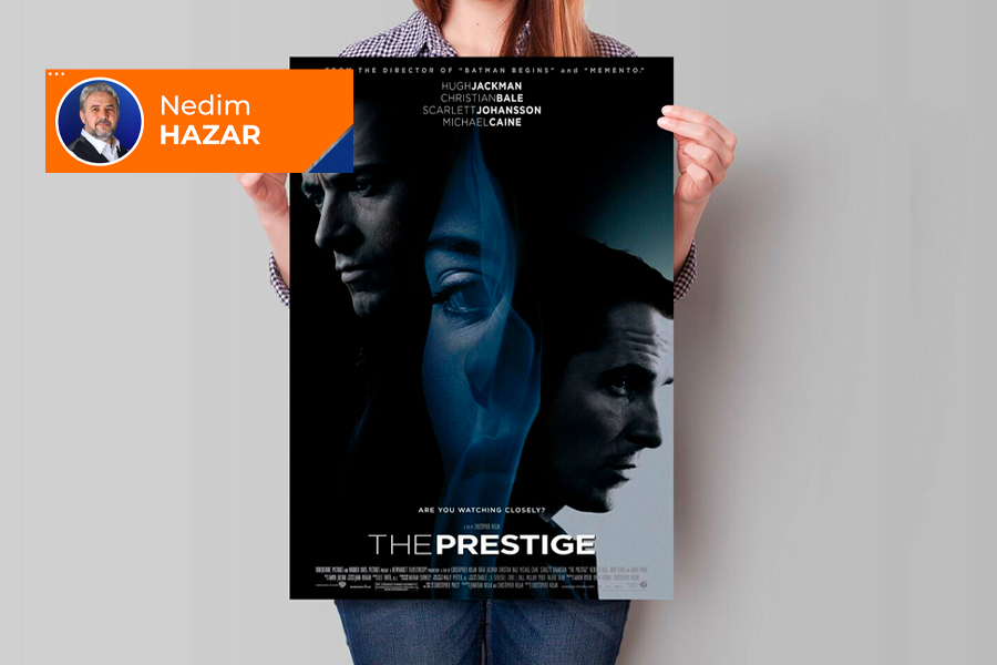 Christopher ve Jonathan Nolan’ın The Prestige’in senaryosuna giriş yaparken, “biz” değil “ben” olarak konuşmaları, izleyiciyi duality, ikizler, çiftler ve paralellikler hakkında bir komplo fark etmeye teşvik eder. Düello yapan iki sihirbaz fikri, yazar/yazarların “fraktal” zaman ve bakış açısı kavramı ile çarpıtılan aldatma olasılıklarıyla doludur.