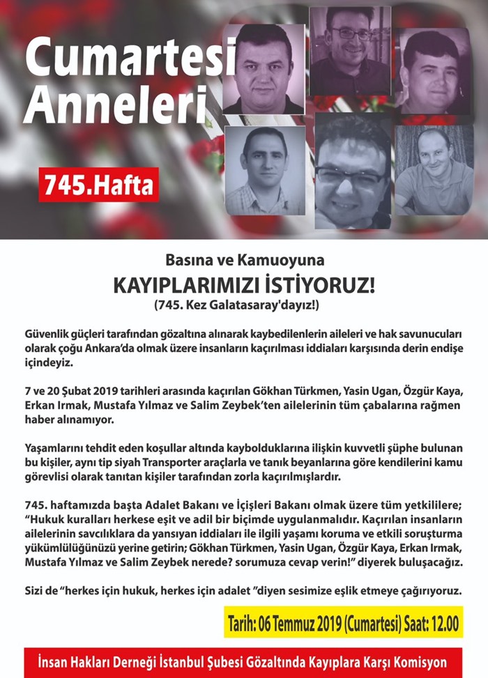 Doksanlı yıllarda ‘Beyaz Toros’larla kaçırılanların yakınlarının hak aramak için oluşturduğu Cumartesi Anneleri 745. haftalarında bu sefer son birkaç yıldır hukuksuzca kaçırılanlar için bir araya gelecek. Özellikle 15 Temmuz sonrası ‘Siyah Transporter’larla kaçırılan Gökhan Türkmen, Yasin Ugan, Özgür Kaya, Erkan Irmak, Mustafa Yılmaz ve Salim Zeybek için bir araya gelecek olan Cumartesi anneleri “Bu kişiler Nerede? sorumuza cevap verin!” diyecek.