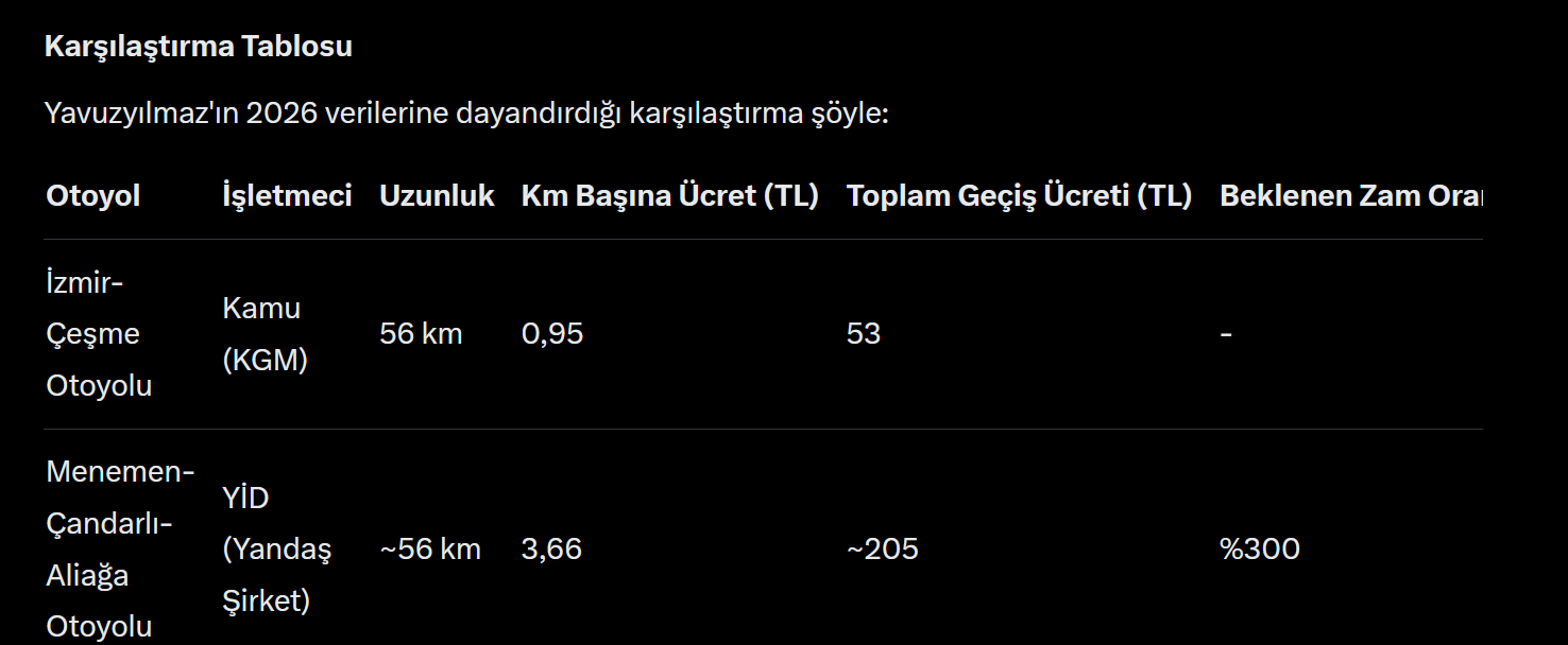 Yavuzyılmaz’a göre, özelleştirme sonrası İzmir-Çeşme geçiş ücreti doğrudan YİD modelindeki seviyeye çekilecek ve vatandaş bir kez daha soyulacak. Özelleştirme süreci resmi makamlarca henüz doğrulanmadı.