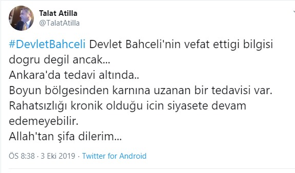 ”#DevletBahceli Devlet Bahceli’nin vefat ettigi bilgisi dogru degil ancak… Ankara’da tedavi altında.. Boyun bölgesinden karnına uzanan bir tedavisi var. Rahatsızlığı kronik olduğu icin siyasete devam edemeyebilir. Allah’tan şifa dilerim…”
