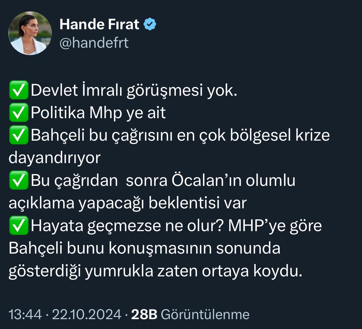 Sergilenen tabloyu görmekte zorlanan Beştepe’nin sesi Hürriyet Ankara Temsilcisi Hande Fırat, atılan adım AK Parti’ye değil, MHP’ye ait olduğunu söyledi. Hande Fırat, kendince “Ya tutmazsa!” diye düşünüp ön almaya çalışıyor.