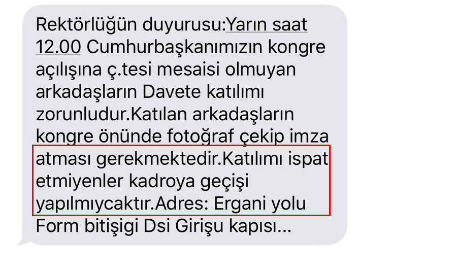 “Cumhurbaşkanımızın kongre açılışına mesaisi olmayan arkadaşların katılımı zorunludur. Katılan arkadaşların kongre önünde fotoğraf çekip imza atması gerekmektedir. Katılımı ispat etmeyenlerin kadroya geçişi yapılmayacaktır”