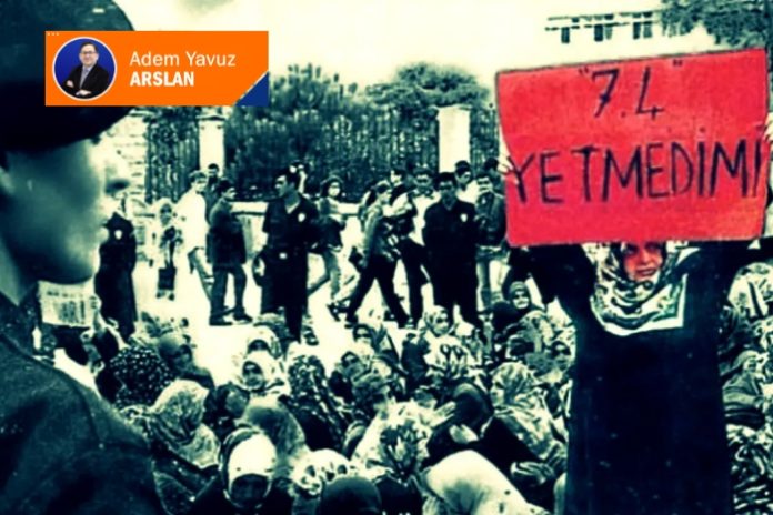 O dönem çok yaygın olan üniversitelerdeki başörtüsü yasaklarını protesto eden öğrencilerden birisi Marmara Üniversitesi kampüsü önündeki eylemde “7,4 yetmedi mi?” yazan bir pankart açmıştı.