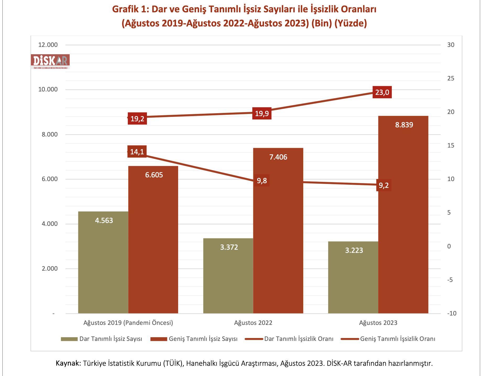 “DİSK-AR tarafından TÜİK verilerinden yararlanarak yapılan hesaplamaya göre mevsim etkisinden arındırılmış geniş tanımlı işsiz sayısı ise Ağustos 2023’te 8 milyon 839 bin kişi olarak gerçekleşti. TÜİK’e göre pandemi öncesinde, 2019 Ağustos’ta yüzde 14,1 olan dar tanımlı işsizlik Ağustos 2023’te yüzde 9,2 olarak gerçekleşti. Ancak aynı yıllarda geniş tanımlı işsizlik yüzde 19,2’den yüzde 23’e yükseldi. Son 1 yılda geniş tanımlı işsiz sayısı yaklaşık 1 milyon 433 bin artarak 7,4 milyondan 8,8 milyona yükseldi. Covid-19 salgını sonrası geniş tanımlı işsizlik oranı 3,8 puan, geniş tanımlı işsiz sayısı ise 2 milyon 234 bin kişi arttı.”
