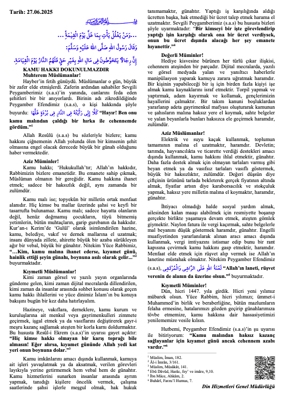 Hutbede kamu çalışanlarının ‘hediye’ kisvesiyle kurduğu çıkar ilişkisinden vakıf mallarını üzerine geçiren kişilere, kaçak elektrik ve su kullanımından ihtiyacı olmadığı halde sosyal yardım alan kişilerin de kamunun hakkı yemesi sebebiyle cehennem ateşine maruz kalacakları anlatıldı.