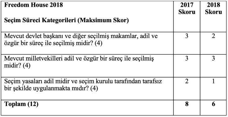 Freedom House çalışmasının “seçim süreci” kategorisinde ülkelerin alabileceği maksimum skor 12 iken Türkiye’nin skoru 2017’den bu yana 8’den 6’ya gerilemiş. Türkiye, seçim süreci kategorisindeki skoruyla çalışmada dikkate alınan 209 ülke arasında aynı skoru alan 12 ülkeyle birlikte 128’inci sırayı paylaşıyor.