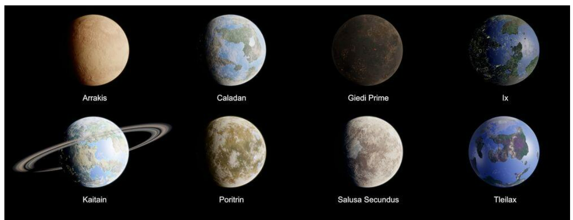 Dune evrenindeki gezegenler hem üzerinde yaşayan hanedanlıkların karakterini hem de ütopik bir geleceğin topografisini oluşturması açısından özenle yazılmış görünüyor. Dile kolay tam 85 kurgusal gezegenden bahsediyoruz. Öyle ki, bazı gezegenlerin ismini vermiş ama içini doldurmaya ömrü yetmemiş Frank Herbert’in.