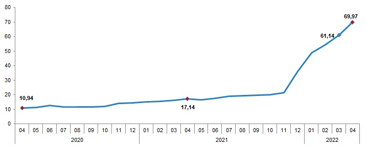 TÜİK’e göre Nisan ayında yıllık enflasyon yüzde 69,97 olarak ölçülmüştü. Dolar kurundaki artışla birlikte başta enerji olmak üzere bir çok kalemde fiyatlar yukarı yönlü güncellendi. Mayıs ayında yıllık enflasyonun yüzde 75 civarında gelmesi sürpriz olmayacak. Zira zamlar yağmur gibi yağıyor… Et, süt, çay, akaryakıt…