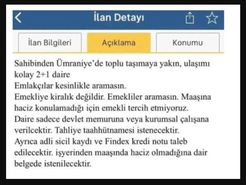 Bakanlık açıklamasında, “Bir ilan sitesinde ’emekliye kiralık değildir’ ibaresiyle yayımlanan konut ilanı, Bakanlığımızca yapılan inceleme sonucunda Taşınmaz Ticareti Hakkında Yönetmeliğe aykırılık tespit edilerek yayından kaldırılmış, ilgili emlak işletmesi hakkında idari para cezası uygulanmıştır. Ticaret Bakanlığı olarak; her vatandaşımızın eşit şartlarda hizmet almasını, piyasada adil, dürüst ve ahlaka uygun ticari faaliyetlerin sürdürülmesini, toplum vicdanını zedeleyen her türlü ayrımcı uygulamanın önlenmesini temel önceliklerimiz arasında görüyoruz. Dürüst ticaretin, hakkaniyetin ve toplumsal sorumluluğun yanında olmaya; vatandaşımızın, hakkını ve hukukunu korumaya kararlılıkla devam edeceğiz.” denildi.