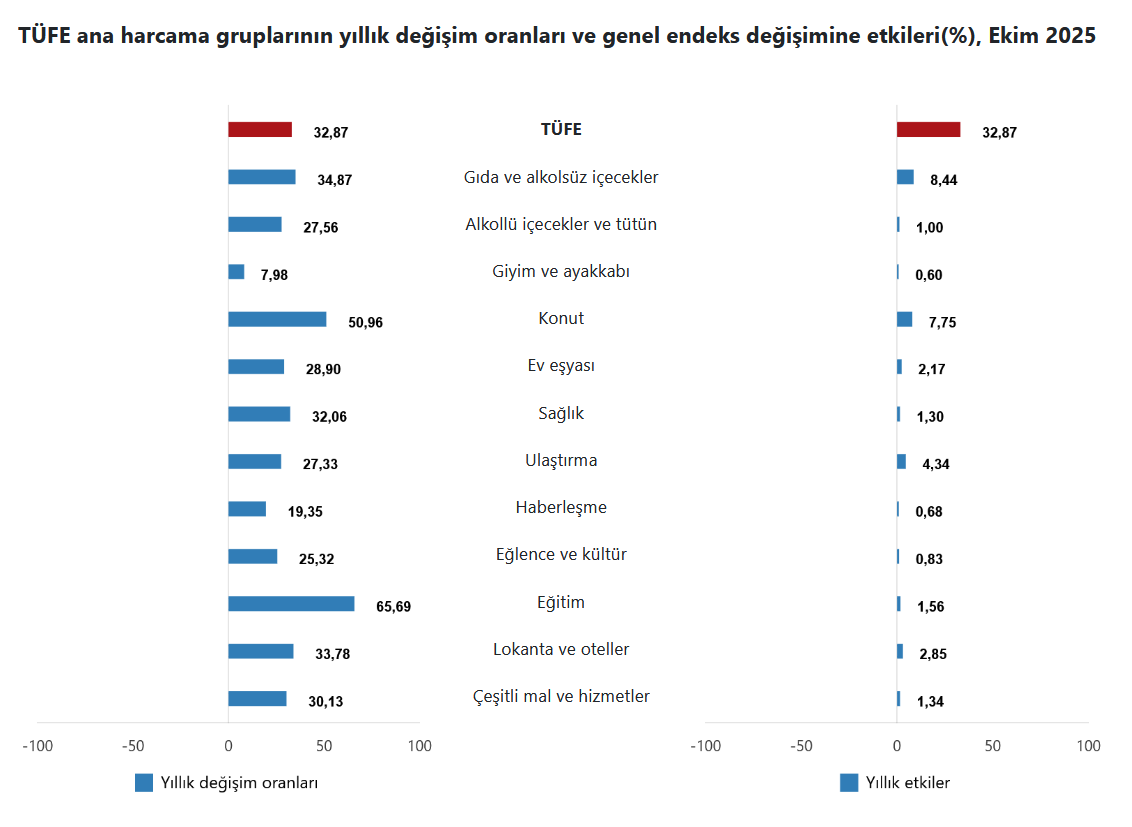 Türkiye İstatistik Kurumu (TÜİK), merakla beklenen ağustos ayı enflasyon verilerini duyurdu. Açıklanan verilere göre ekim ayında enflasyon yüzde 2,55 olarak hesaplandı. TÜİK’e göre ilk 10 aydaki enflasyon yüzde 28,63. Yıllık enflasyon ise 32,87.