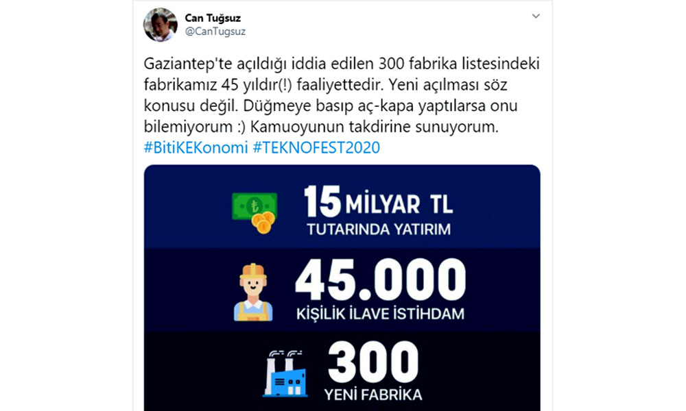 Tuğsuz, “Gaziantep’te açıldığı iddia edilen 300 fabrika listesindeki fabrikamız 45 yıldır(!) faaliyettedir. Yeni açılması söz konusu değil. Düğmeye basıp aç-kapa yaptılarsa onu bilemiyorum 🙂 Kamuoyunun takdirine sunuyorum.” diye yazdı.