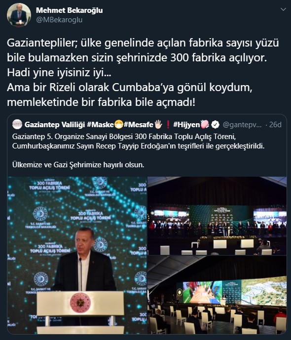 CHP İstanbul Milletvekili Mehmet Bekaroğlu ise kinayeli bir şekilde “Ülke genelinde açılan fabrika sayısı yüzü bile bulamazken sizin şehrinizde 300 fabrika açılıyor. Hadi yine iyisiniz iyi” dedi.