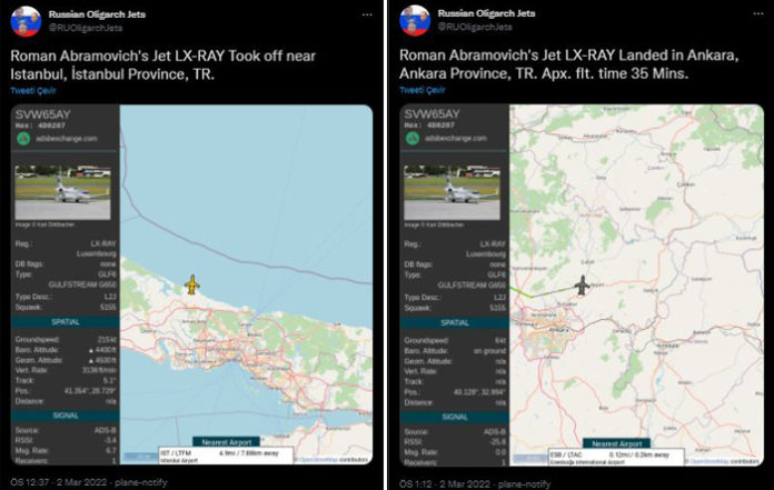 ABD ve Avrupa’nın ‘yaptırım’ uyguladığı Rus oligark ve milyarderlere AKP rejimi kucak açtı! Rus milyarder Roman Abramovich’in özel jetiyle dün önce İstanbul’a, oradan da Ankara’ya indiği tespit edildi. Rus milyarderin, AKP’li Cumhurbaşkanı Recep Tayyip Erdoğan’la görüşüp görüşmediği konusunda bilgi yok.