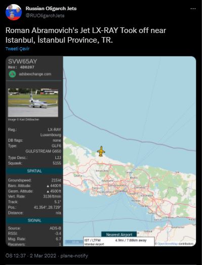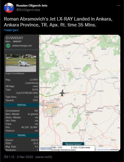 Sweeney’in oluşturduğu yeni hesabına göre Chelsea Futbol Kulübü’nün sahibi Roman Abramovich’in özel jetleri ve helikopterleri, Pazartesi gününden itibaren Moskova, Bakü, Saint Kitts ve Nevis ve Dubai gibi çeşitli destinasyonlarda iniş ve kalkış yaptı.