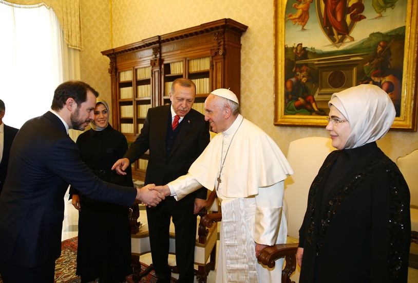Erdoğan’ın Papa ziyaretine eşi Emine Erdoğan’ın yanısıra damadı Enerji Bakanı Berat Albayrak ve kızı Esra Albayrak, bakanlar Mevlüt Çavuşoğlu, Nihat Zeybekçi, Ömer Çelik gibi isimler de katıldı.