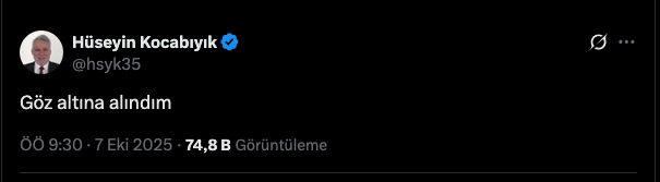 Hüseyin Kocabıyık, hukuksuz operasyonlarıyla bilinen İstanbul Cumhuriyet Başsavcılığı’nın İBB’ye yönelik başlattığı operasyonda tutuklanan İBB Başkanı Ekrem İmamoğlu’na destek vermesinin ardından AKP’den ihraç edilmişti. Kocabıyık, o dönem yaptığı paylaşımda, “Recep Tayyip Erdoğan… geleceğin yer burası mıydı? Biz bunlar için mi mücadele ettik? Bunun için mi mahkemelerde süründük yıllarca? Sen aslında kendine darbe yaptın haberin yok!” ifadelerini kullanmıştı.