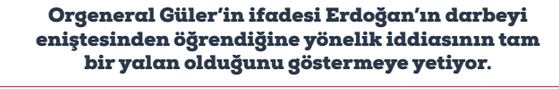 Orgeneral Güler’in ismini sanıyorum giderek daha fazla duyacağız. Güler olaylardan sonraki savcılık ifadesinde Erdoğan ile çelişmişti. Genelkurmaya gelen Fidan’ın olaylar başlamadan saatler önce Erdoğan’ın yanındaki Koruma Müdürünü arayarak durumdan haberdar ettiğini açık etmişti. Güler’in bu ifadesi Erdoğan’ın darbeyi eniştesinden öğrendiğine yönelik iddiasının tam bir yalan olduğunu göstermeye yetiyor.