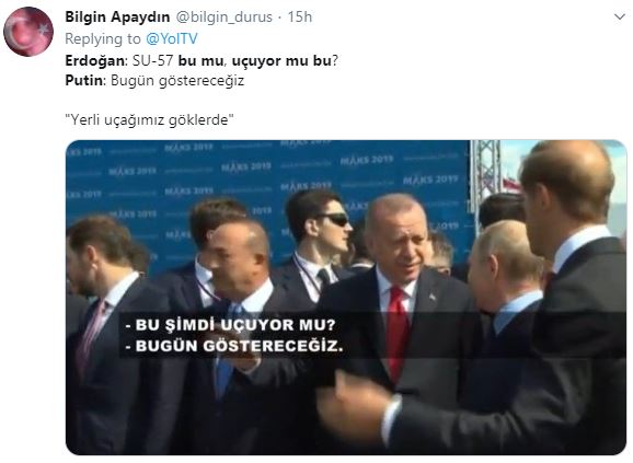 Cumhurbaşkanı Erdoğan, SU-57 uçaklarını incelerken de Rusya lideri Putin’e uçağı işaret edip “Bu uçuyor mu?” diye sordu. Putin “Uçuyor, size bugün göstereceğiz” cevabını verdi. Erdoğan esprili bir dille “Bundan mı alacağız?” deyince Putin, “İstiyorsanız alabilirsiniz” ifadesini kullandı.