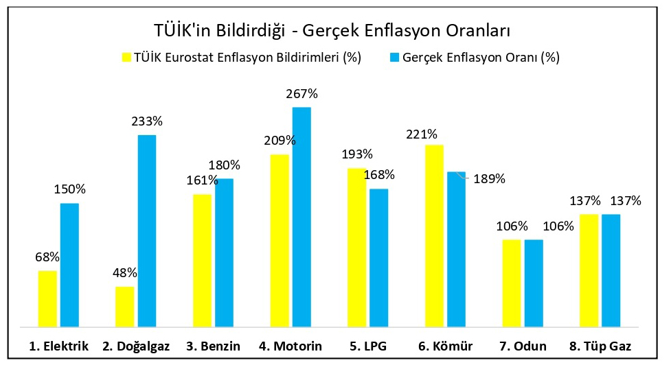 İyi Partili Erhan Usta’nın paylaşımlarına göre, Eurostat enerji enflasyonu tüm dünyada, ülke genelindeki tüm fiyatları içerir şekilde hesaplanırken, Türkiye için TÜİK üzerinden Eurostat’a gönderilen enerji enflasyonu verisinde ciddi manipülasyon yapılıyor. Usta, elektrik, doğalgaz, benzin, motorin, LPG, kömür, odun ve tüpgaz kalemlerinin ‘ağırlıkları’nın eksik bildirildiğini grafiklerle anlatıyor.