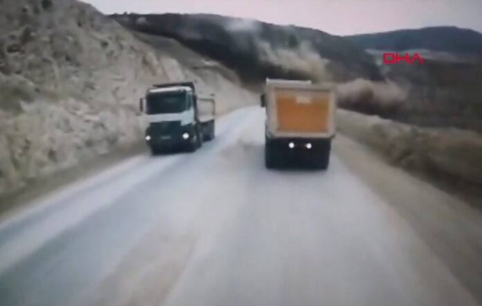 Erzincan’da yaşanan maden faciası sırasında hariyat kamyonlarının son anda toprak altında kalmaktan kurtulduğu, hafriyat kamyonlarının geri manevra yaparak bölgeden uzaklaştığı görüldü.