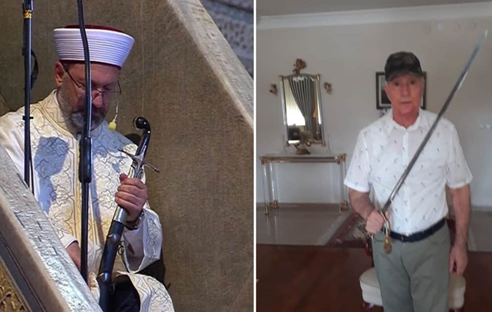 “Ali Erbaş’ın kılıcının sağ kısmı haç işaretini andırıyor. Erbaş kılıcını kınından çıkarsın, okusun-üflesin Ayasofya’nın önüne gelsin. Ben bu kılıçtan etkilendim. Türk Silahlı Kuvvetleri’nde subay olduğum için bana da bir kılıç ve tabanca verildi. Ben de kılıcımla gideyim, dövüşelim.”