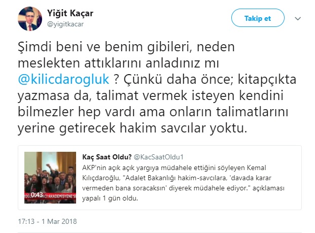 Kaçar twitter hesabından, “Şimdi beni ve benim gibileri, neden meslekten attıklarını anladınız mı Kılıçdaroğlu” diye sordu ve şöyle devam etti: “Çünkü daha önce; kitapçıkta yazmasa da, talimat vermek isteyen kendini bilmezler hep vardı ama onların talimatlarını yerine getirecek hakim savcılar yoktu.”