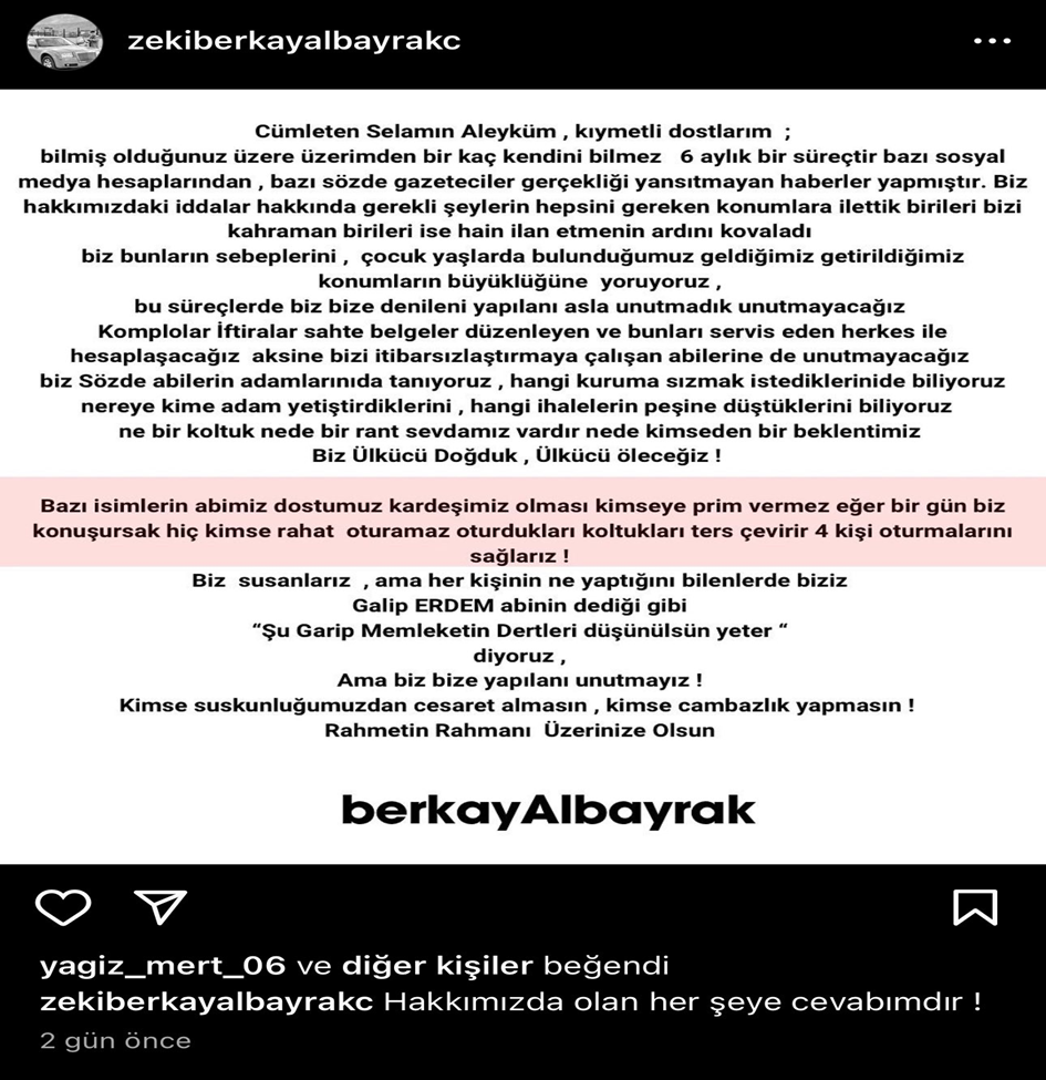 Zeki Berkay Albayrak, geçtiğimiz aylarda Ülkü Ocakları Ankara İl Başkan Yardımcılığı görevinden istifa ederek yurt dışına çıkmıştı. Yunanistan’dan yaptığı paylaşımda, “Bazı isimlerin abimiz kardeşimiz olması kimseye prim vermez. Eğer birgün biz konuşursak hiç kimse rahat oturamaz” diyen Albayrak, bir süre sonra, ismi Sinan Ateş suikastı soruşturmasında geçen eski MHP Milletvekili Olcay Kılavuz’la Kosova’da buluşmuştu.