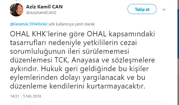 Avukat Aziz Kamil Can ise bu durumun bugün böyle olsa bile yarın hukuk geldiğinde değişeceğini söyledi. Can, “OHAL KHK’lerine göre OHAL kapsamındaki tasarrufları nedeniyle yetkililerin cezai sorumluluğunun ileri sürülememesi düzenlemesi TCK, Anayasa ve sözleşmelere aykırıdır. Hukuk geri geldiğinde bu kişiler eylemlerinden dolayı yargılanacak ve bu düzenleme kendilerini kurtarmayacaktır.” ifadesini kullandı.