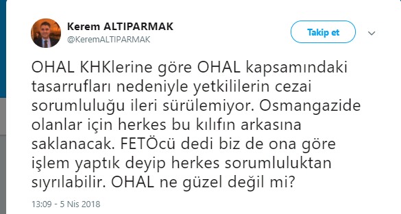 Durumu değerlendiren akademisyen Kerem Altıparmak, “OHAL KHKlerine göre OHAL kapsamındaki tasarrufları nedeniyle yetkililerin cezai sorumluluğu ileri sürülemiyor. Osmangazide olanlar için herkes bu kılıfın arkasına saklanacak. F…’cü dedi biz de ona göre işlem yaptık deyip herkes sorumluluktan sıyrılabilir. OHAL ne güzel değil mi?” ifadesini kullandı.