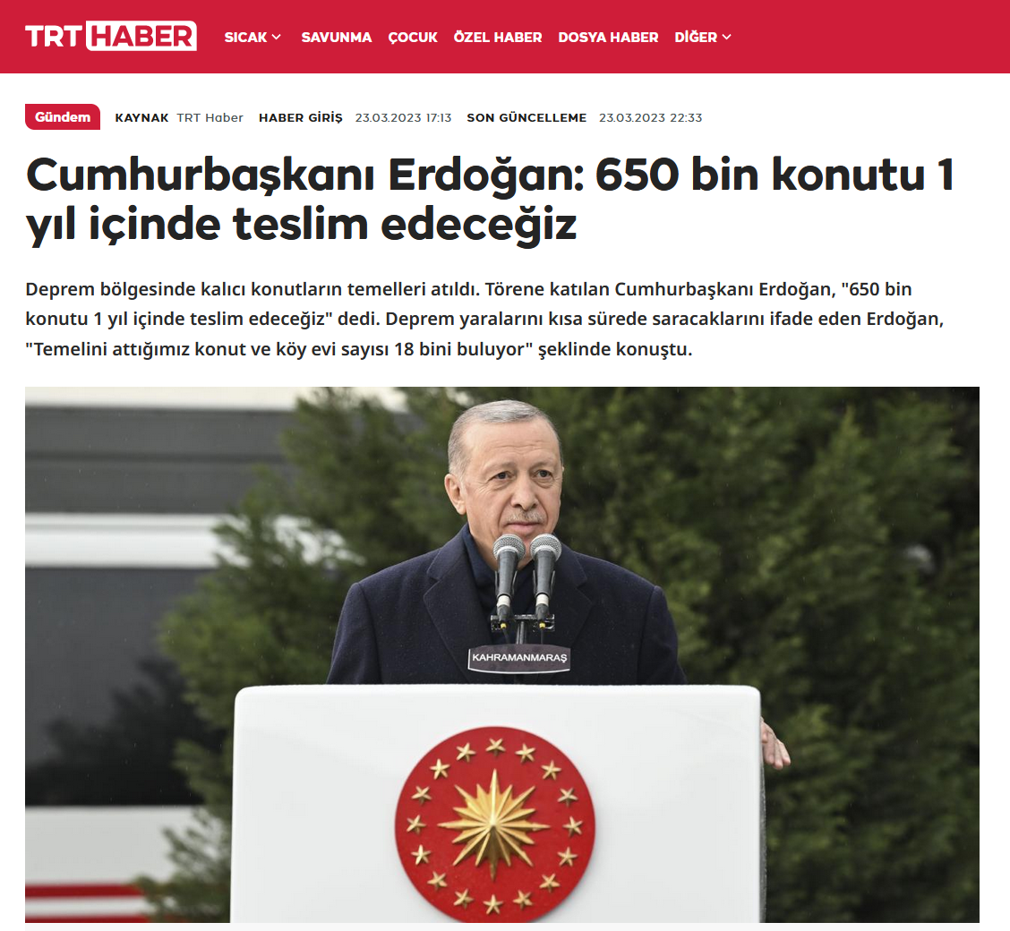 AKP’li Cumhurbaşkanı Recep Tayyip Erdoğan, 6 Şubat 2023’te meydana gelen Kahramanmaraş merkezli depremlerden sonra 23 Mart’ta yaptığı konuşmada, “Mevcut planlamaya göre bir yıl içinde 319 bin konut ve köy evini yapacağız. Bir yıl içinde biz bu kalıcı konutları bitirerek hak sahibi vatandaşlarımıza teslim edeceğiz. Yaraları kısa sürede saracağız. Toplamda 650 bin konut yapacağız.” dedi.