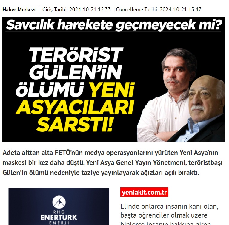“Fethullah Gülen de imtihan dünyasından berzah âlemine göçmüş. Hakkındaki iddiaların hesabı artık öbür tarafta görülecek. Bu iddialar gerekçe gösterilerek yapılan ve nice insanın mağduriyetine sebep olan hukuksuzlukların son bulması dileğimizi bir kez daha tekrarlayarak, Allah rahmet ve adaletiyle muamele eylesin diyoruz. Camianın başı sağ olsun.”