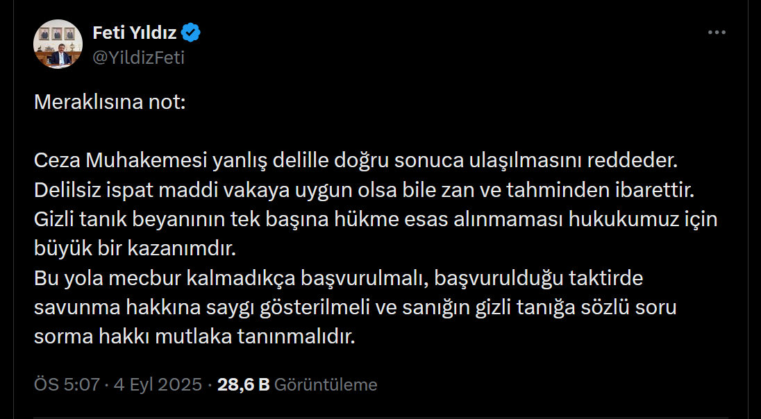 Son dönemde yaptığı ‘adalet ve hukuk’ temalı tweetleriyle dikkat çeken MHP Genel Başkan Yardımcısı Feti Yıldız, ‘Meraklısına not!” başlığıyla yaptığı son paylaşımda tek başına ‘gizli tanık’ beyanlarının hükme esas alınamayacağını hatırlattı.