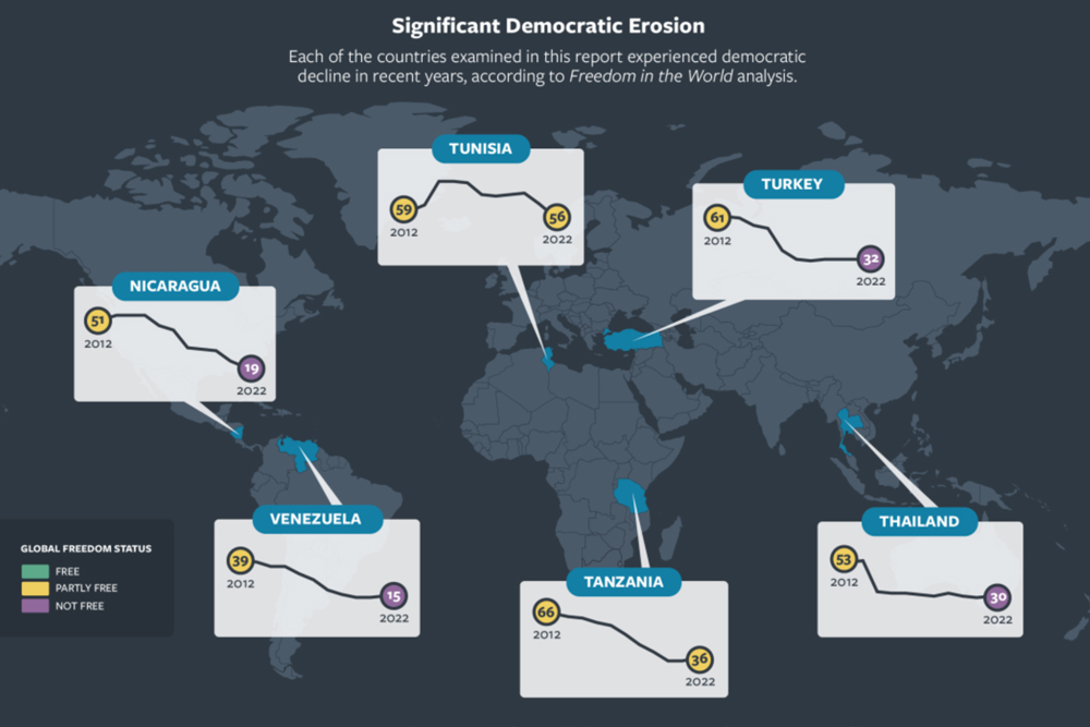 - Siyasi tutuklamalar, muhalefeti sınırlandırmak için önemli bir araçtır ve daha geniş çaplı demokratik erozyona eşlik eder. Son dönemde demokratik gerileme yaşayan altı ülkede siyasi gerilim dönemlerinde hükümet muhaliflerine yönelik hapis cezaları, gözaltılar ve kovuşturmalar artmıştır: Nikaragua, Tanzanya, Tayland, Tunus, Türkiye ve Venezuela.