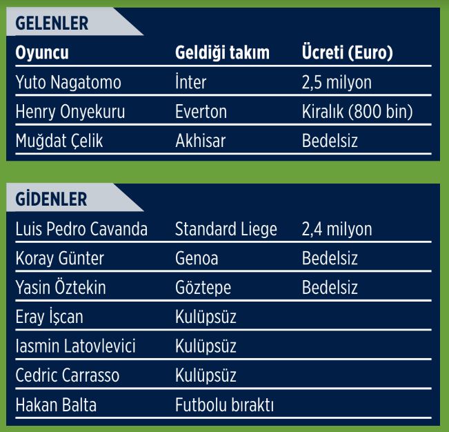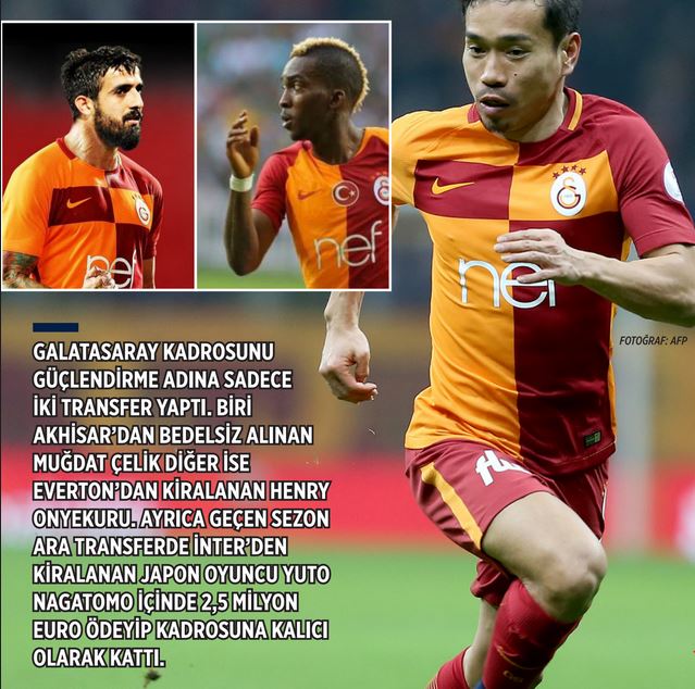 Galatasaray kadrosunu güçlendirme adına sadece iki transfer yaptı. Biri Akhisar’dan bedelsiz alınan Muğdat Çelik diğer ise Everton’dan kiralanan Henry Onyekuru. Ayrıca geçen sezon ara transferde İnter’den kiralanan Japon oyuncu Yuto Nagatomo içinde 2,5 milyon Euro ödeyip kadrosuna kalıcı olarak kattı.