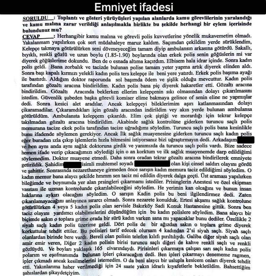Daha sonra oradan tekrar gözaltı aracına bindirilerek emniyete getirildik. Şahidim isimli muhtemel soyadı (…) olan kişi cinsel saldırı olayını gördü ve şahittir. Sonrasında nezarethaneye girmeden önce sarışın kadın memura taciz edildiğimi söyledim. O kadın memur bana alaycı şekilde, “Hmmm sen taciz mi edildin!” diyerek dalga geçti.