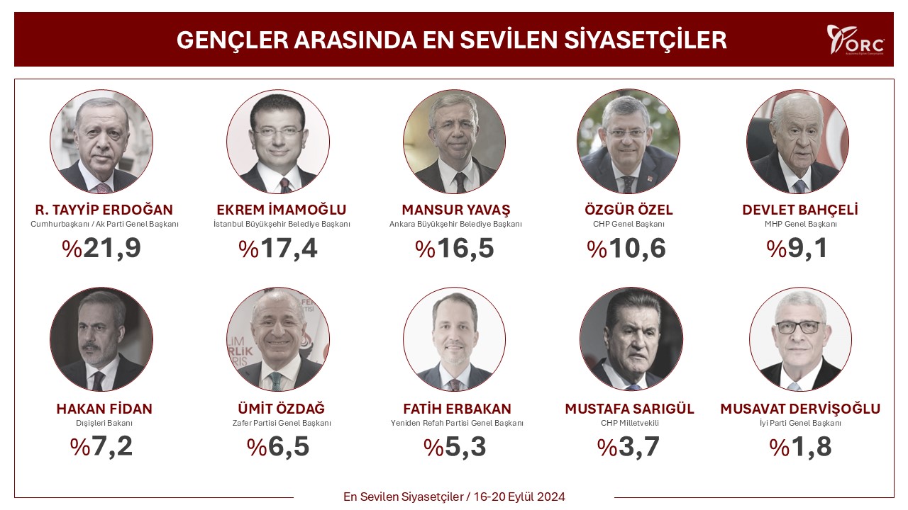 Her zaman medyaya yansıyan anket sonuçlarına dikkat kesilirim. Son haftalarda çok sayıda anket rakamları haberlere konu oldu. Yazıya otururken yeni bir anket gördüm. ORC gençlere ‘en sevdiği 10 siyasetçinin kimler olduğunu’ sormuş. Birinci sırada kim var biliyor musunuz; Cumhurbaşkanı Erdoğan. Oranı düşük ama; yüzde 21… Erdoğan’ı, Ekrem İmamoğlu ve Mansur Yavaş izliyor. Listede Mustafa Sarıgül bile var.