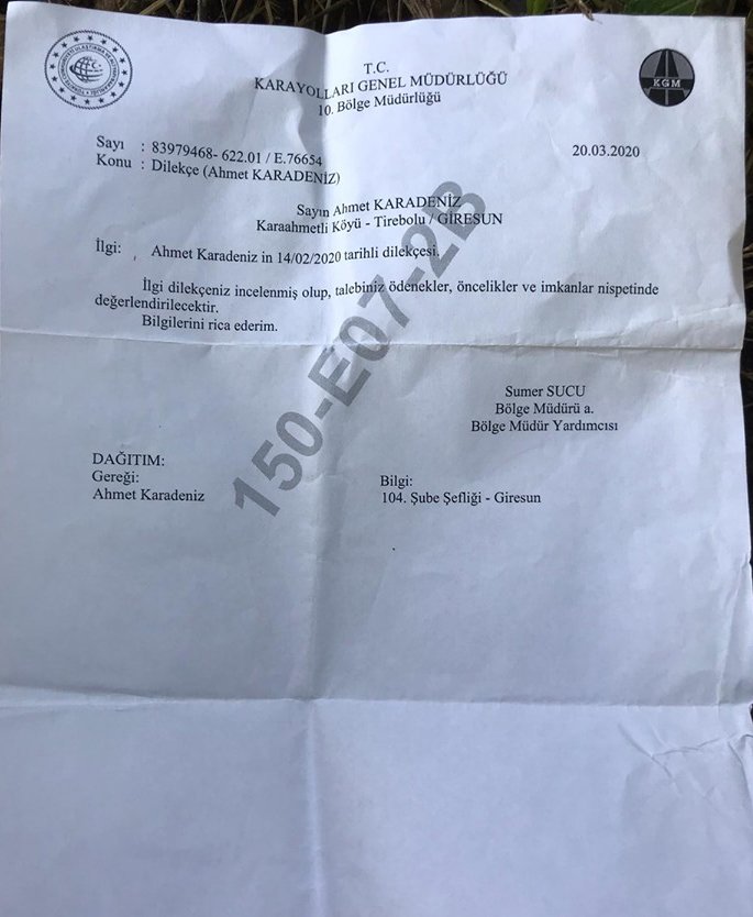 Dilekçeyi işleme koymayan AKP’li İl Genel Meclis Başkanı Ahmet Şahin, dönemin Giresun Valisi Harun Sakıfakoğlu’nun Afet ve Acil Durum Yönetimi Başkanlığı’na (AFAD) talimat verdiğini ilişkin not düşüyor.