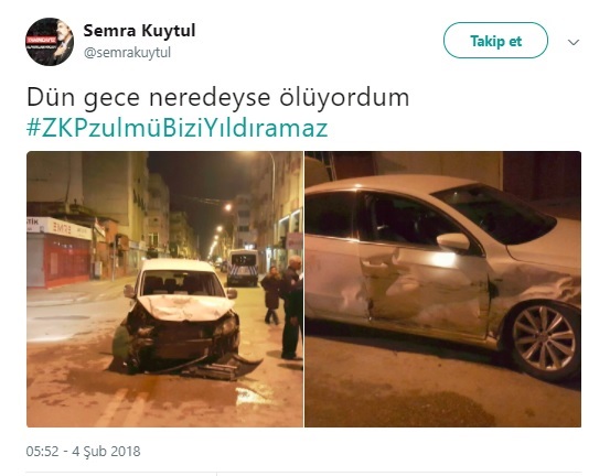 Geçtiğimiz hafta Furkan Vakfı’na yönelik operasyonda 24 kişi ile birlikte gözaltına alınan Alparslan Kuytul’un eşi Semra Kuytul şüpheli bir trafik kazası geçirdi. Eşi ve Furkan Vakfı ile ilgili twitter hesabından sık sık paylaşımlarda bulunan Semra Kuytul bu sefer, “Dün gece neredeyse ölüyordum” paylaşımında bulundu. Ayrıca kaza geçiren arabasının fotoğraflarını paylaştı.