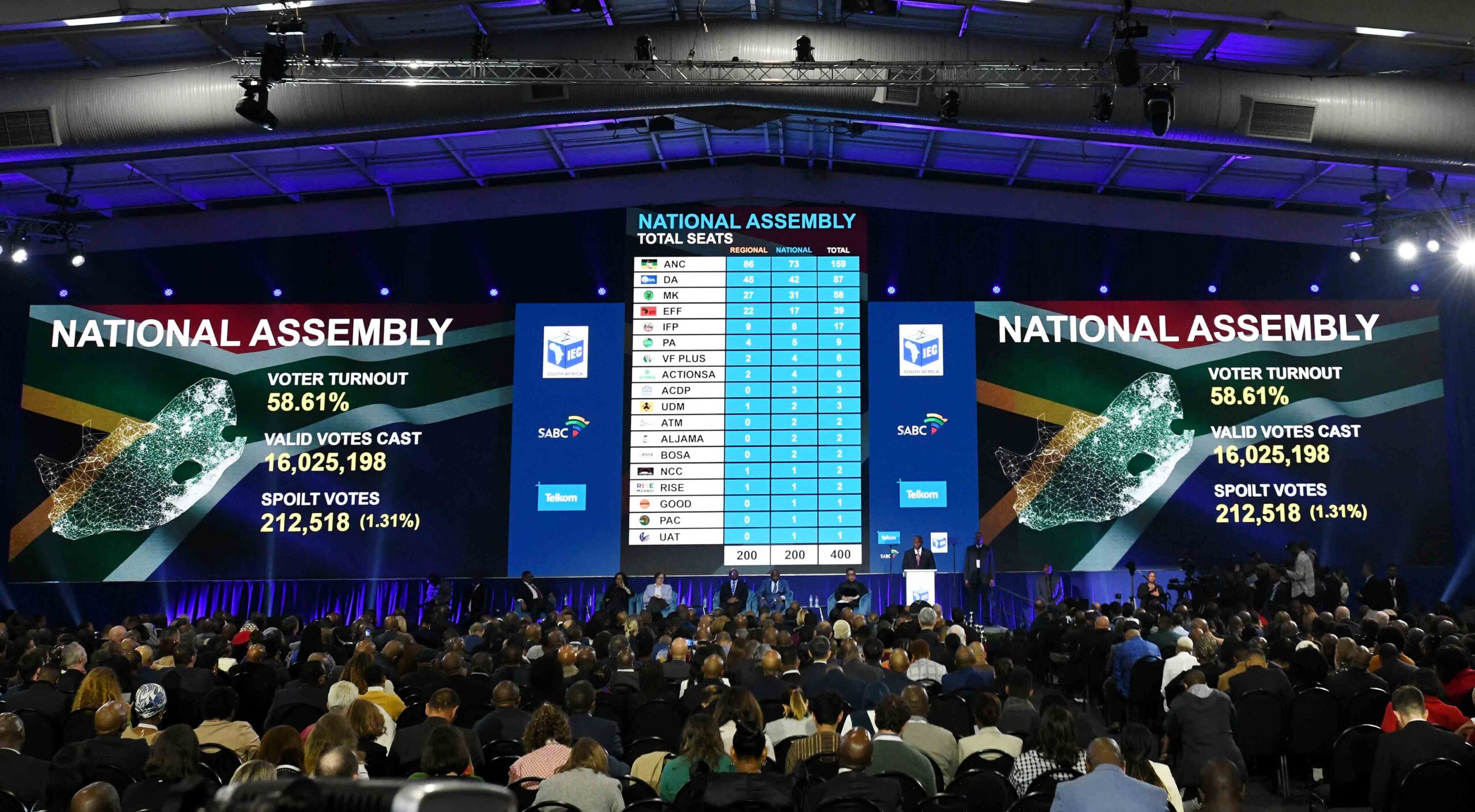 Johannesburg’taki Gallagher Kongre Merkezi’nde kurulan Ulusal Sonuç Operasyon Merkezi’nde Devlet Başkanı Cyril Ramaphosa, siyasi partilerin liderleri, üst düzey devlet görevlileri, diplomatlar ve seçkin davetlilerin katıldığı programda dev ekranlara yansıtılan kesin sonuçlara göre, beyazların partisi olarak bilinen Demokratik İttifak (DA) oyların yüzde 21.81’ini alarak ana muhalefet olarak konumunu korudu. Eski devlet başkanı Jacob Zuma’nın kurduğu Ulusun Mızrağı (MK) sürpriz bir başarı ile 14.58 oranında oy alarak, yüzde 9.52 oranında oy alan radikal sol olarak bilinen Ekonomik Özgürlük Savaşçıları (EFF) partisini açık ara geride bırakmayı başardı. Zulu milliyetçisi olarak bilinen Inkatha Özgürlük Partisi (IFP) 2019’daki seçimlere göre oylarını biraz artırarak yüzde 3.85 oy alırken, göçmen karşıtı ve İsrail yanlısı söylemleri ile öne çıkan eski mahkum Gayton Mckenzie’nin Vatansever İttifak (PA)  ise sürpriz bir başarı ile yüzde 2.6 oranında oy alarak meclise girmeyi başardı. Diğer bir göçmen karşıtı parti ActionSA de yüzde 1.2 oy alarak parlamentoda temsil edilecek.