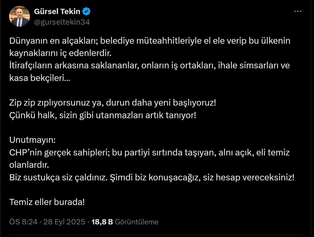 Mahkeme tarafından 2 Eylül’de CHP İstanbul İl Başkanlığı’na kayyım olarak atanan Gürsel Tekin, sosyal medya hesabından yaptığı paylaşımda yolsuzluk ve rüşvet suçlamalarına muhatap olan CHP’li belediyeleri hedef aldı. Önceki gün partiden ihraç edilen Gürsel Tekin, “Dünyanın en alçakları; belediye müteahhitleriyle el ele verip bu ülkenin kaynaklarını iç edenlerdir.” diyerek başladığı mesajında, şu ifadeleri kullandı: “İtirafçıların arkasına saklananlar, onların iş ortakları, ihale simsarları ve kasa bekçileri… Zip zip zıplıyorsunuz ya, durun daha yeni başlıyoruz! Çünkü halk, sizin gibi utanmazları artık tanıyor! Unutmayın: CHP’nin gerçek sahipleri; bu partiyi sırtında taşıyan, alnı açık, eli temiz olanlardır. Biz sustukça siz çaldınız. Şimdi biz konuşacağız, siz hesap vereceksiniz! Temiz eller burada!”